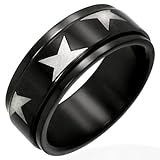 Stainless Steel black spinning band ring with star design, width 8mm. Why choose a Stainless Steel ring for a man or woman? Well its one of the most affordable, and hard wearing metals that we sell in our jewellery range. Stainless steel won’t wear down like silver or gold, it won’t ever tarnish and above all it will take some real knocks which makes it perfect for Mens Rings. The ring will be delivered in a quality ring box with FREE uk shipping, the perfect gift.